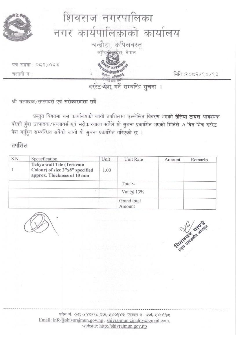दररेट पेश गर्ने सम्बन्धमा।
