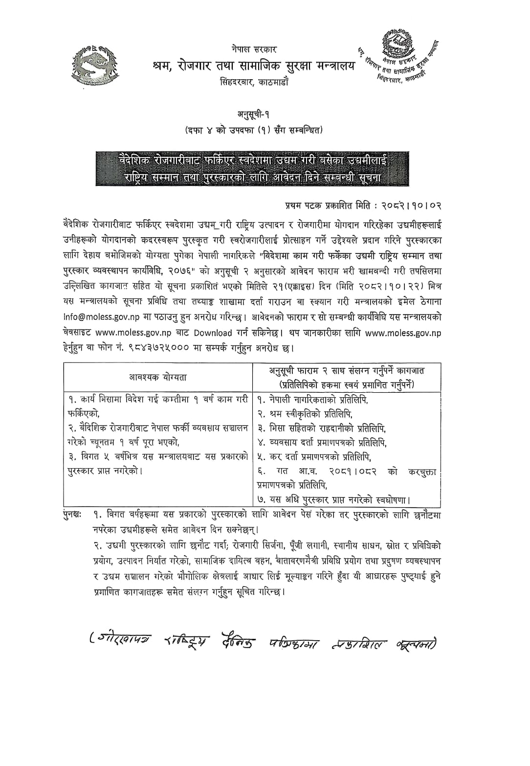 बैदेशिक रोजगारीबाट फर्किएर स्वदेशमा उद्यम गरी बसेका उद्यमीलाई राष्ट्रिय सम्मान तथा पुरस्कारको लागि आवेदन दिने सम्बन्धी सूचना।
