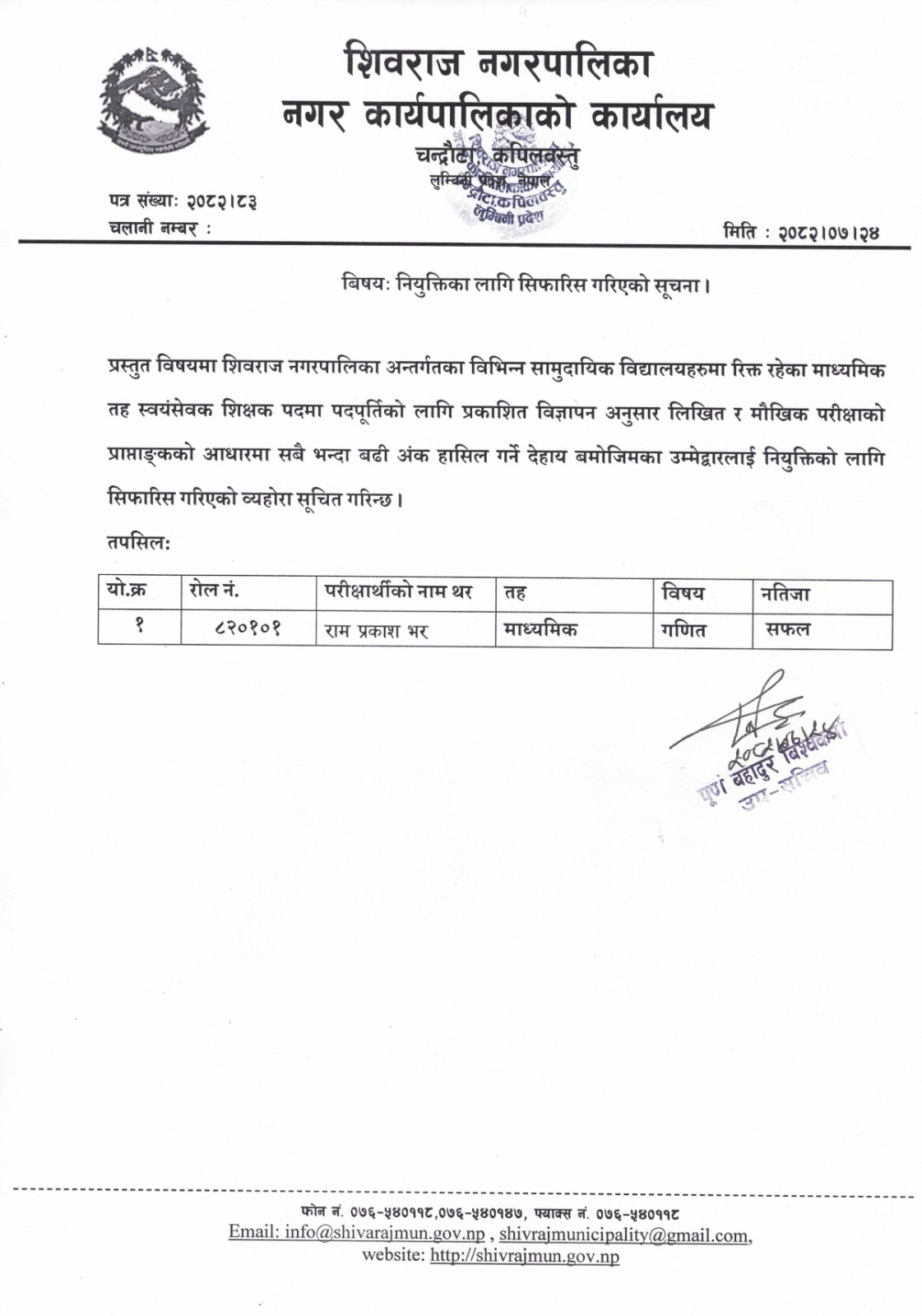 नियुक्तिका लागि सिफारिस गरिएको सूचना
