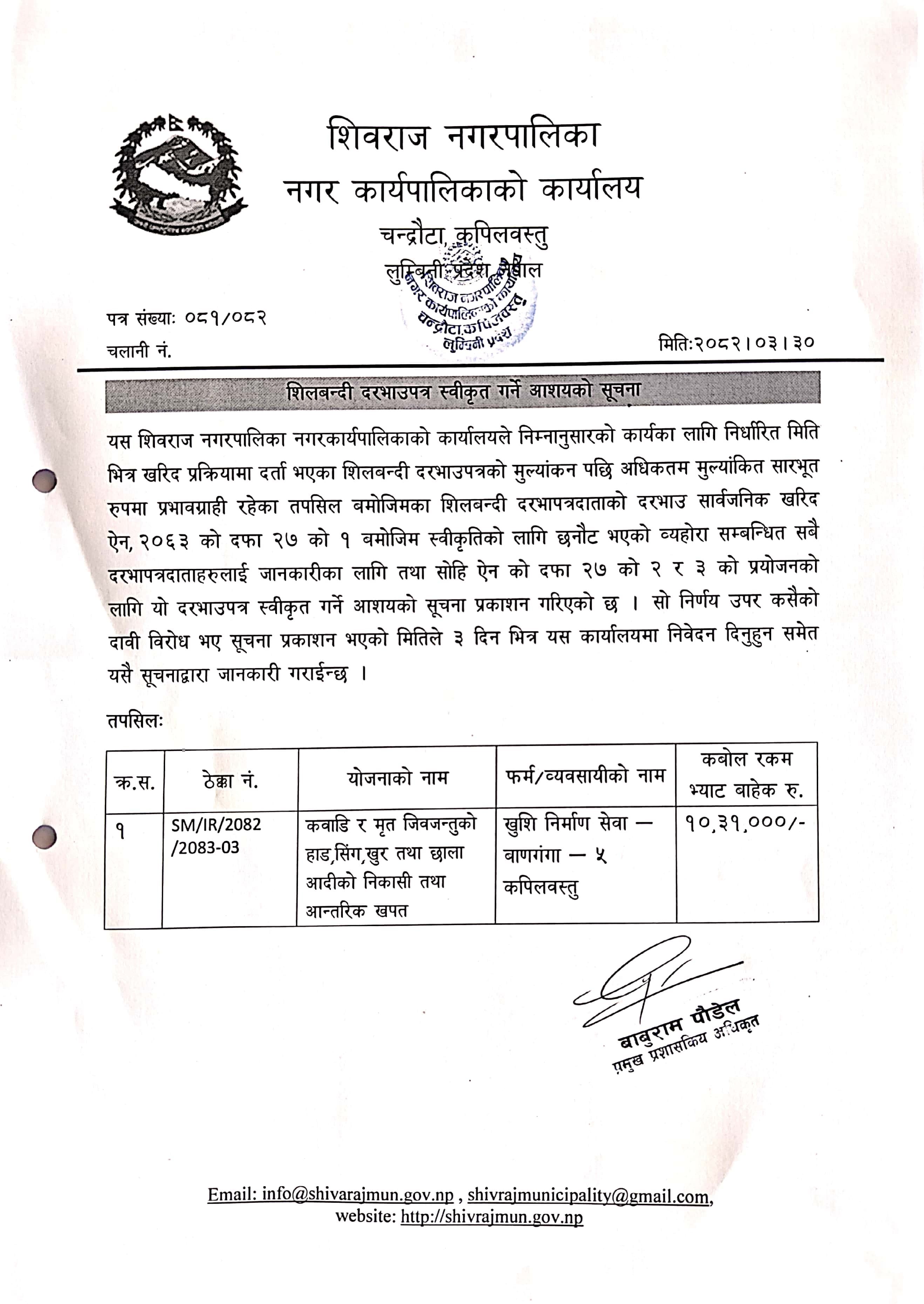कबाडी आदि को शिलबन्दी दरभाउपत्र स्वीकृत गर्ने आशयको सूचना।