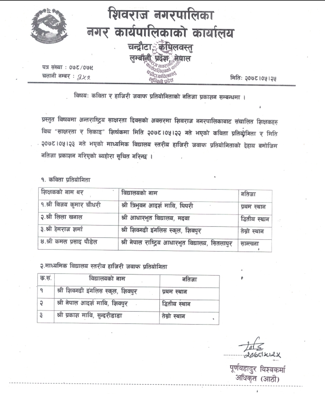 कविता र हाजिरी जवाफ नतिजा प्रकाशन सम्बन्धमा ।