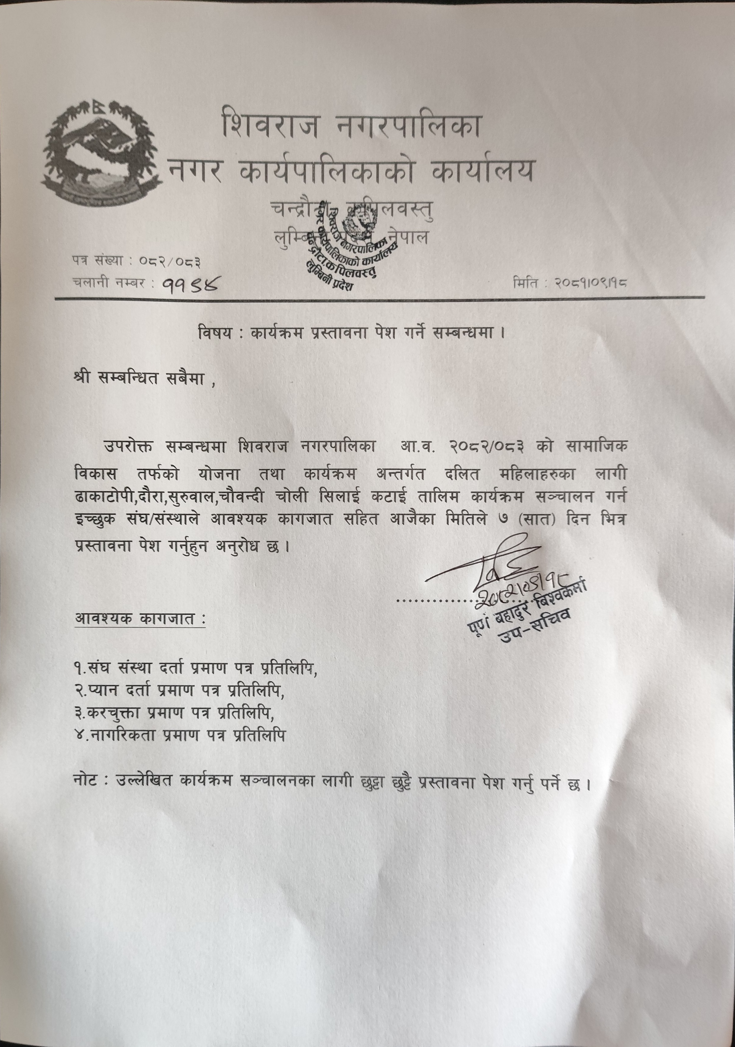 कार्यक्रम सञ्चालनका लागि प्रस्ताव आहवान सम्बन्धमा।
