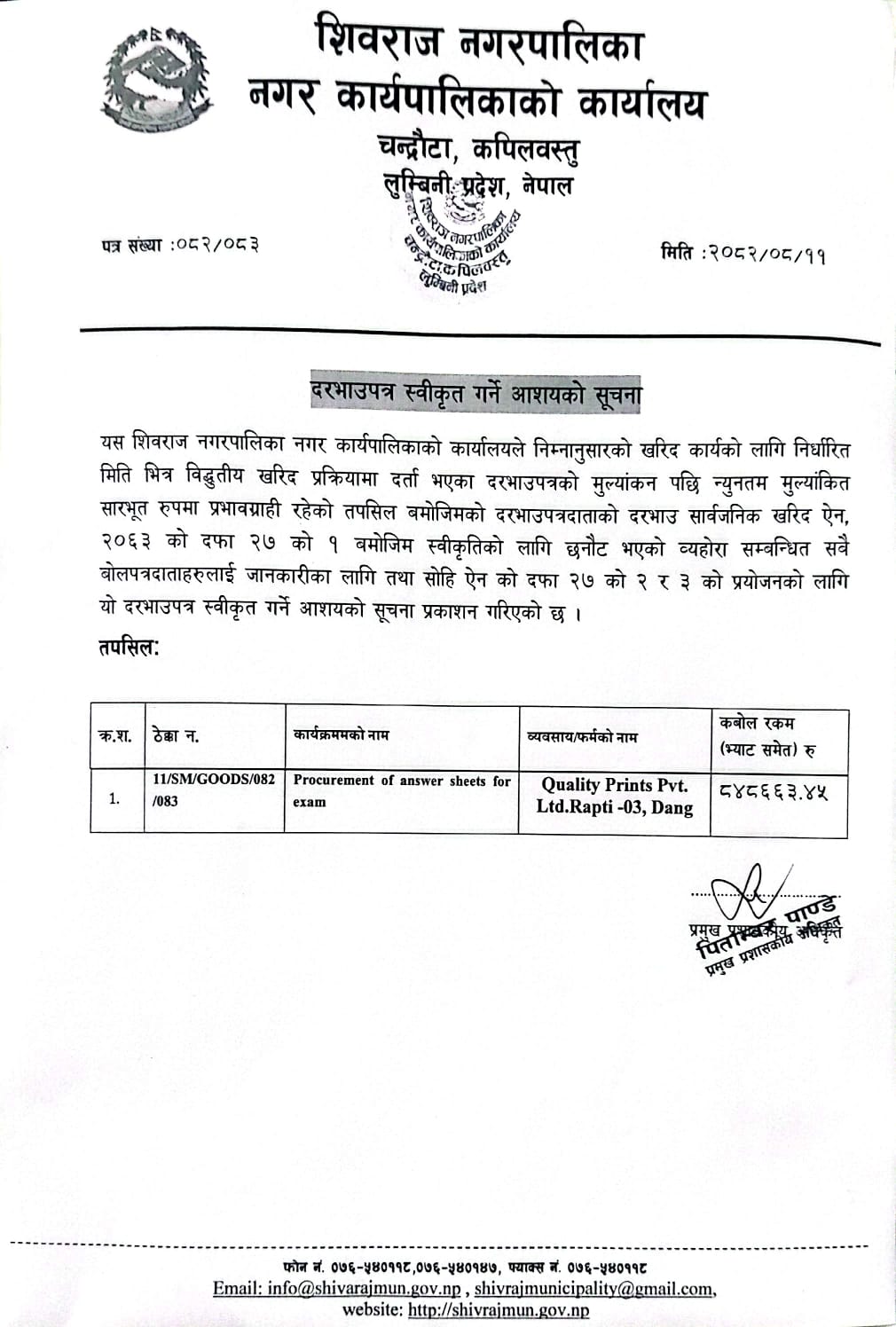 दरभाउपत्र स्वीकृत गर्ने आशयको सूचना