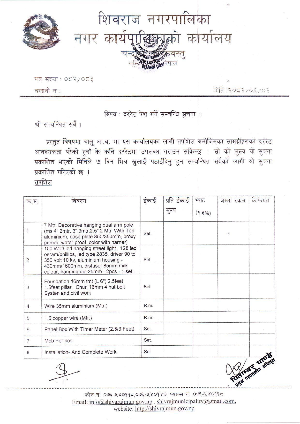 अाय ठेक्काकाे शिलवन्दी दरभाउ पत्र अाव्हानकाे सूचना !!!