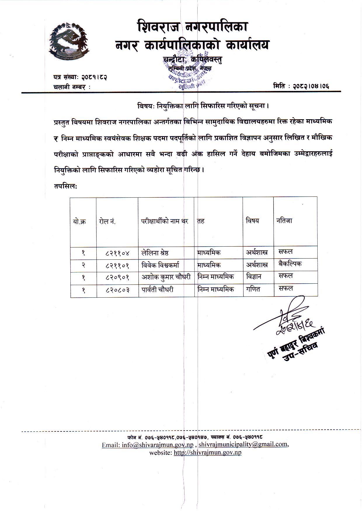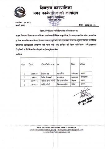 नियुक्तिका लागि सिफारिस गरिएको सूचना।