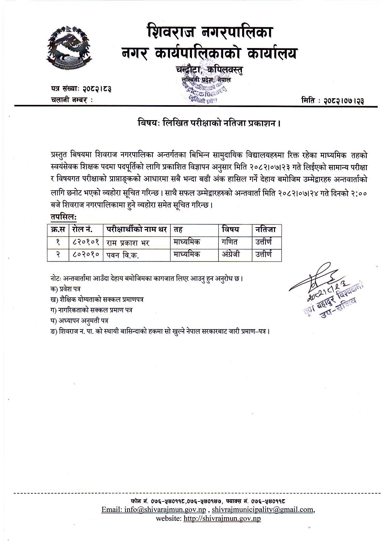 लिखित परीक्षाको नतिजा प्रकाशन सम्बन्धी सूचना : स्वयम सेवक शिक्षक।