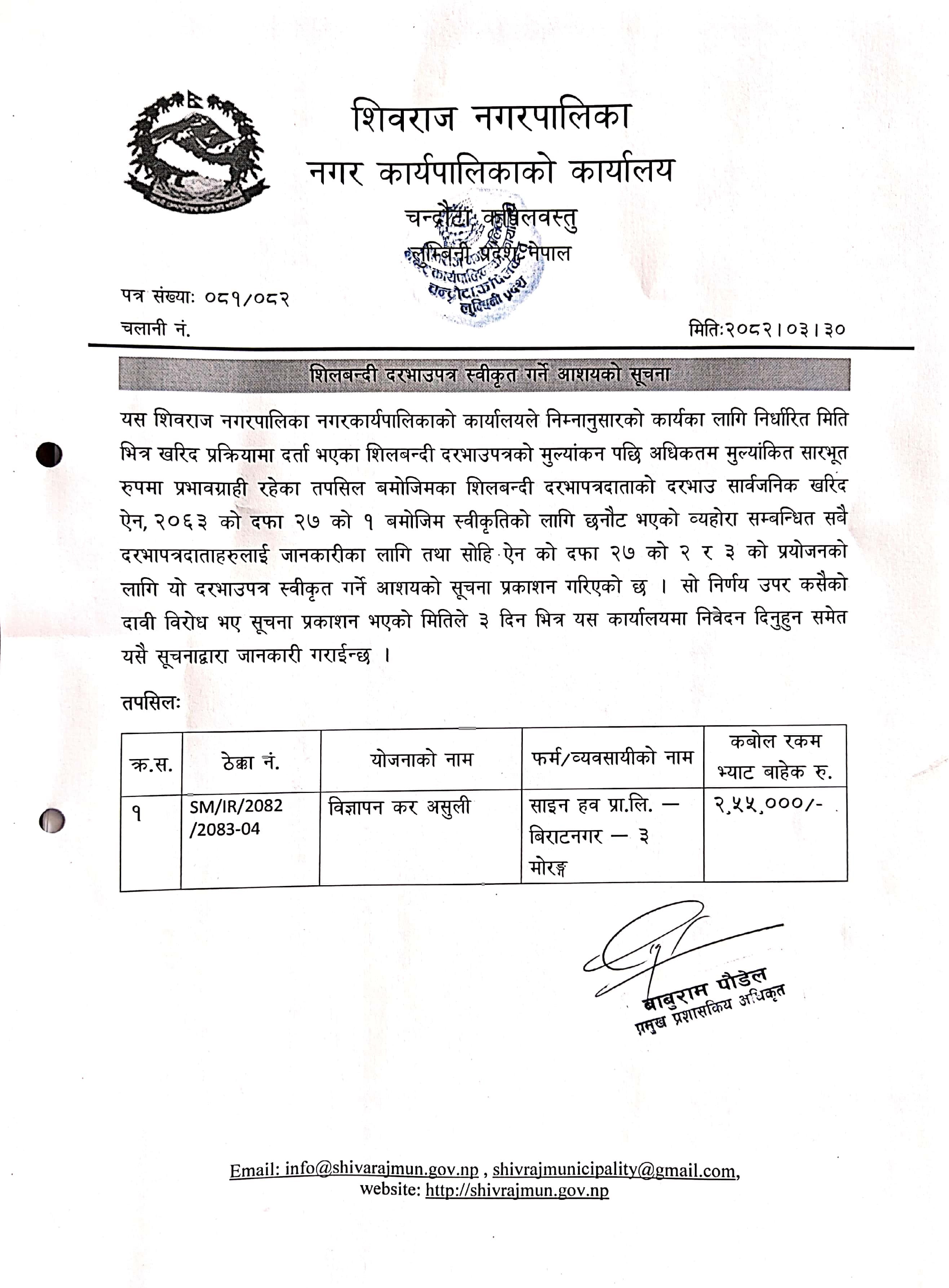 चन्द्रौटा हाट बजार को शिलबन्दी दरभाउपत्र स्वीकृत गर्ने आशयको सूचना।