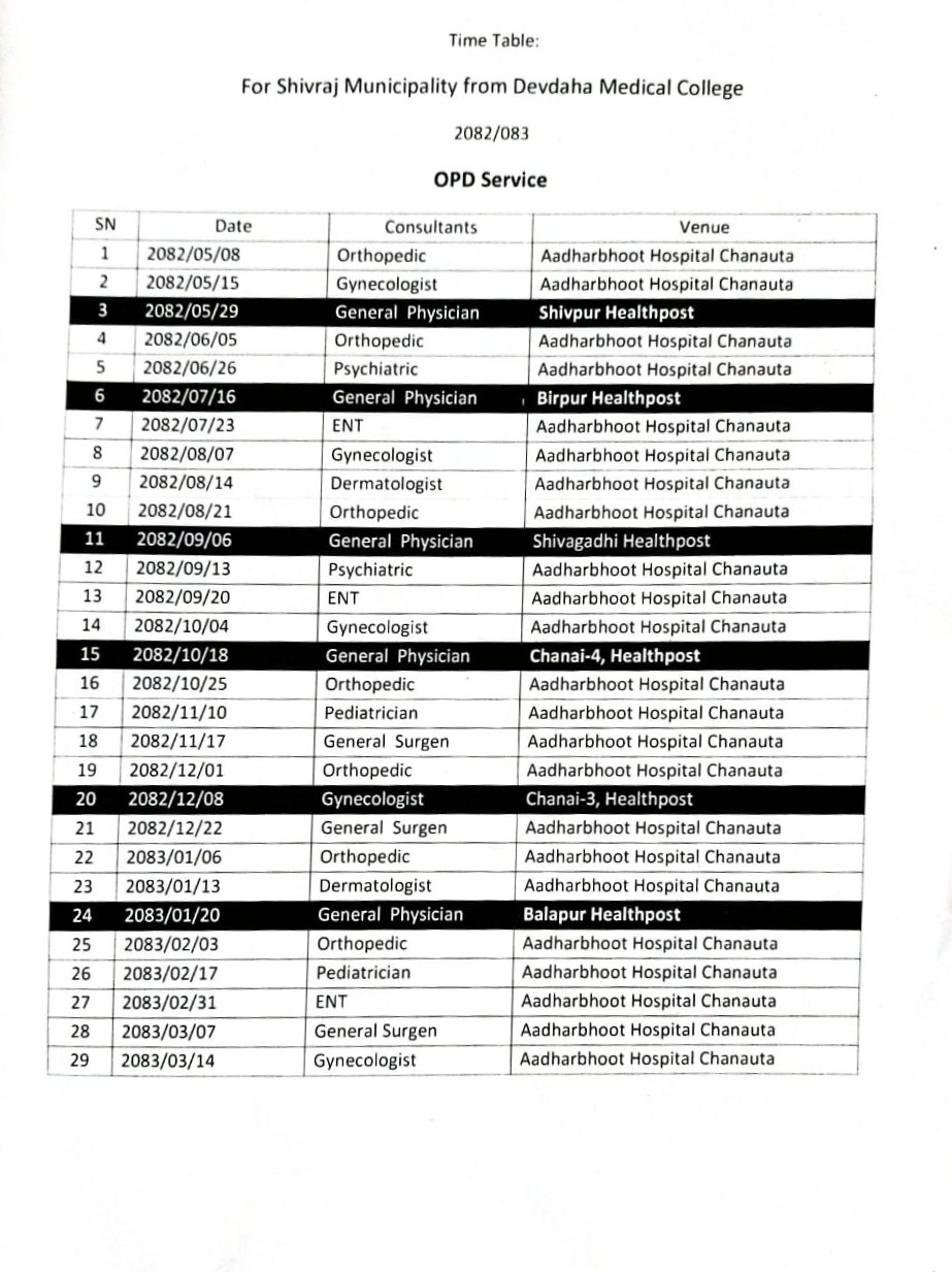 » विशषज्ञ चिकित्सक आउने समय तालिका।