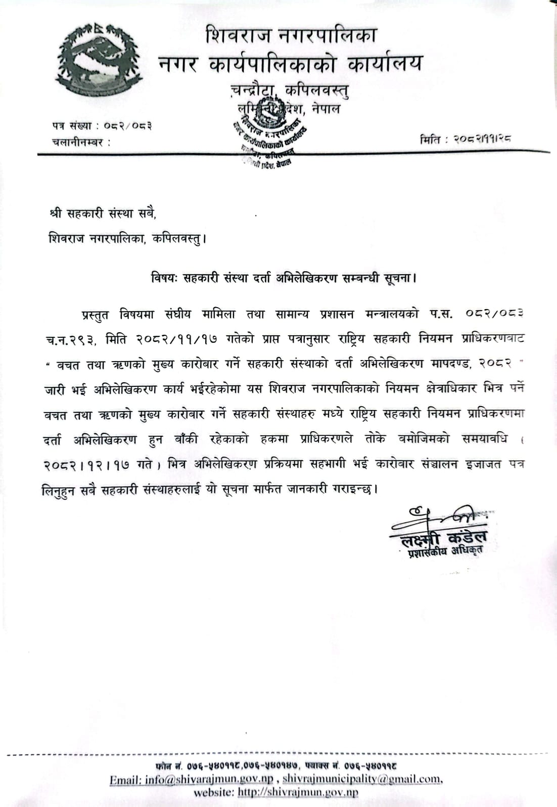 सहकारी संस्था दर्ता अभिलेखिकरण सम्बन्धी सूचना।