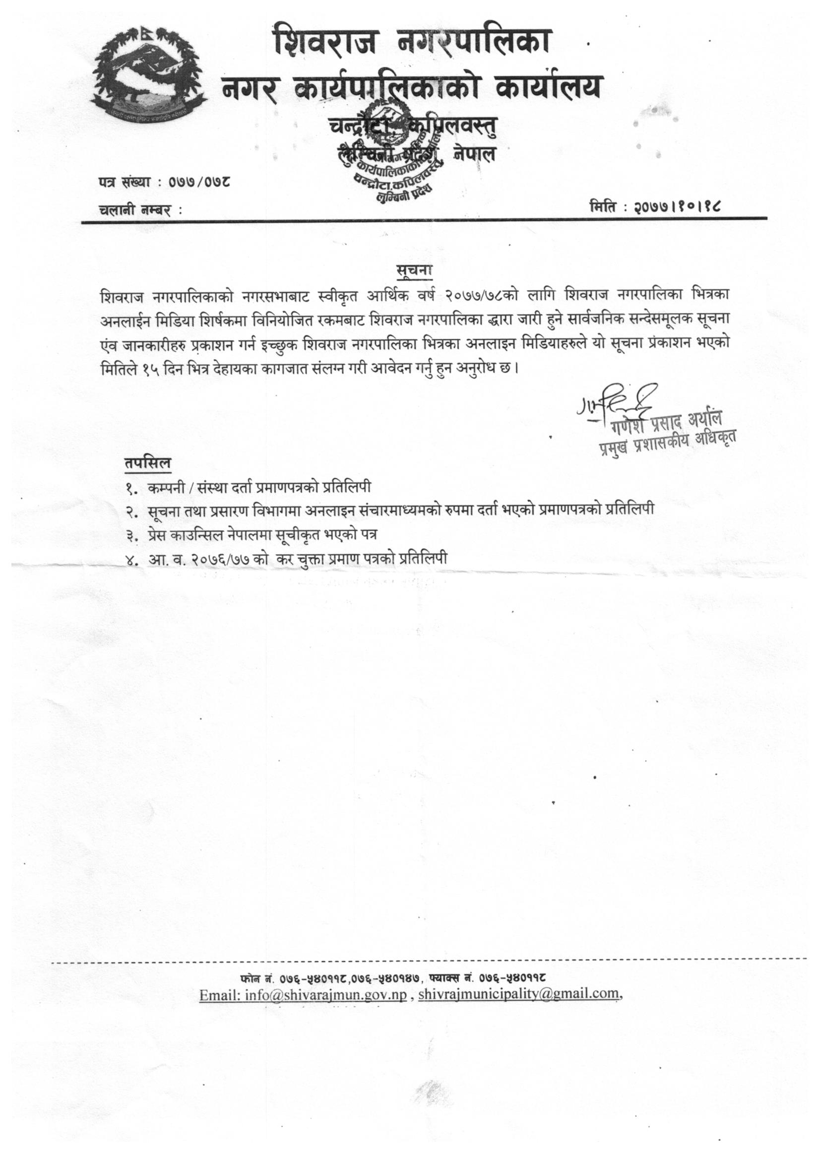 अाय ठेक्काकाे शिलवन्दी दरभाउ पत्र अाव्हानकाे सूचना !!!