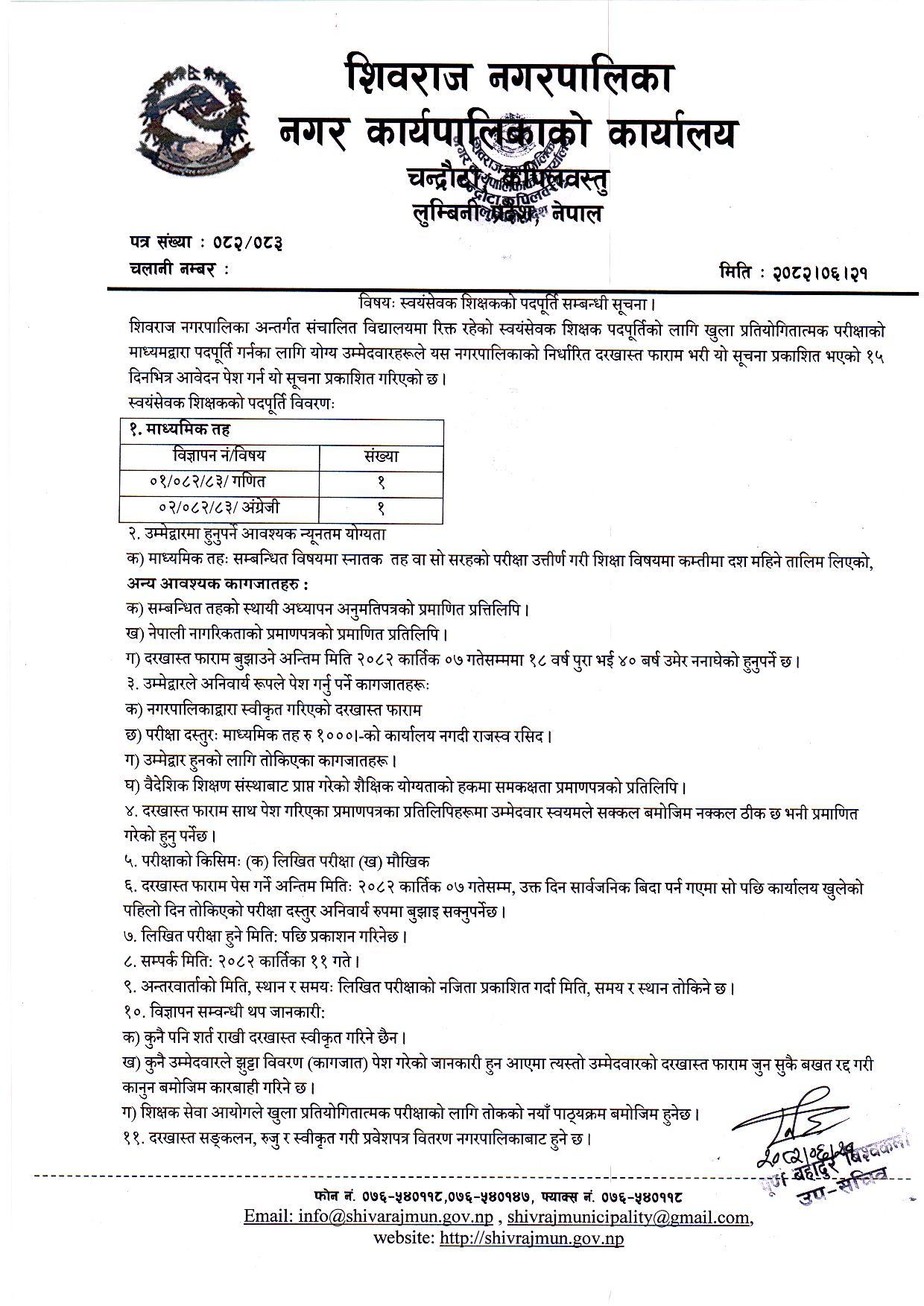 स्वयसेवक शिक्षक पदकाे परीक्षा मिति संशाेधन सम्बन्धि सूचना ।