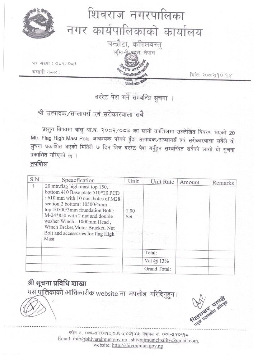 अाय ठेक्काकाे शिलवन्दी दरभाउ पत्र अाव्हानकाे सूचना !!!