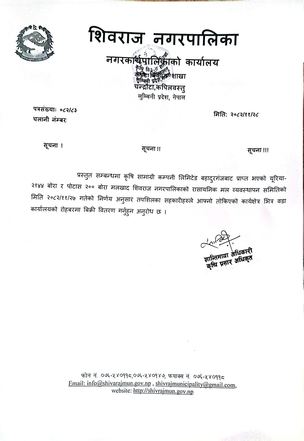 शिवराज नगरपालिका कृषि विकास शाखाकाे सूचना ! सूचना !! सूचना !!!