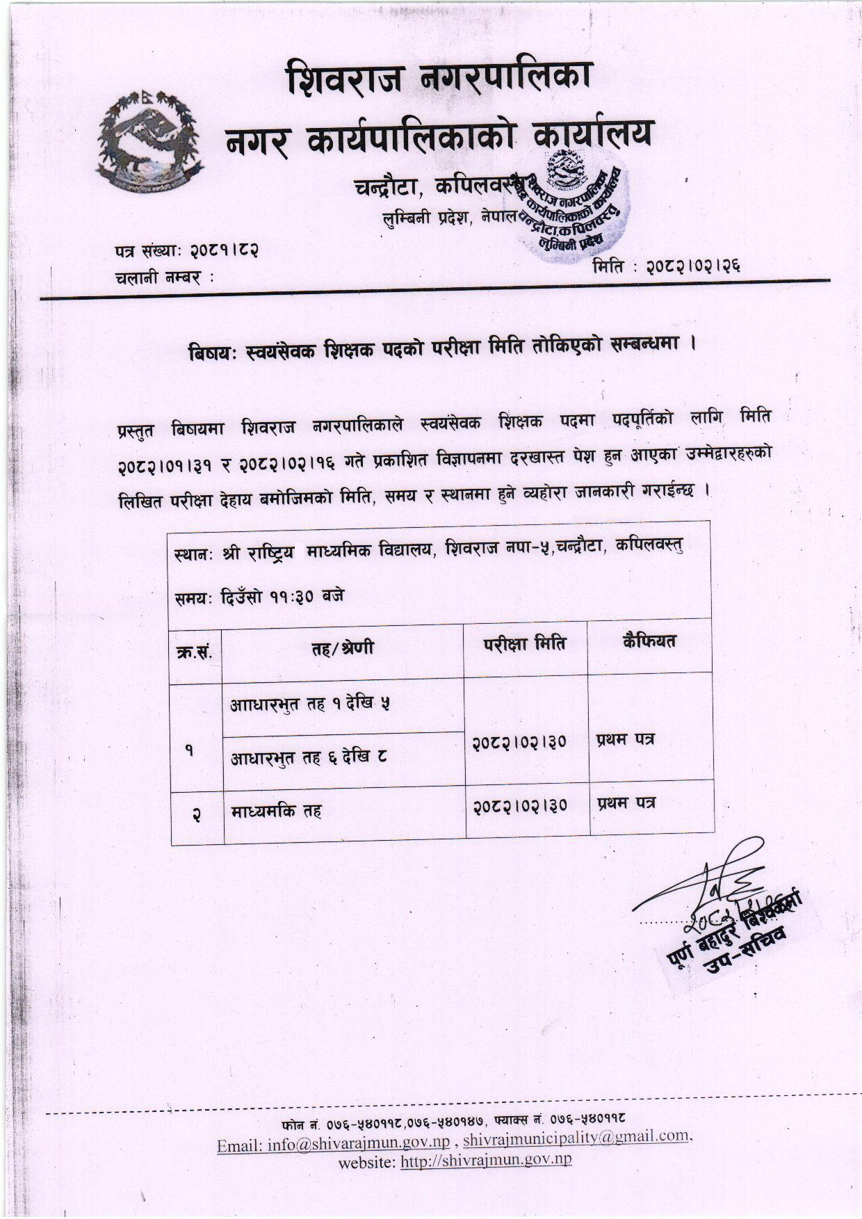 शिवराज नगरपािलकाले निम्न बमाेजिम स्वयंसेवक शिक्षकको बिज्ञापन प्रकाशन गरेकाे छ ।